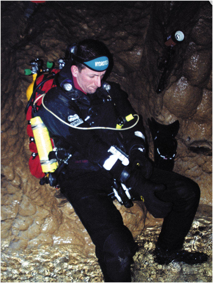 Alexi Rechetniak and I were diving separately on the first dive. Visibility swimming into the flow was around 10m/33ft and at 4ºC/39ºF was not as cold as I expected. The passage was clean white limestone with a heavy gravel floor. The light from my HID light reflected from the walls lighting the 4m/15ft diameter descending tube. The passage covered 100m/328ft and slowly dropped to 10m/33ft following a corkscrew of sweeping turns in the passage. It then descended rapidly in several steps to a ledge at 30m/100ft then dropped vertically to a flake at 40m/133ft where the line ended. I tied in my primary real and dropped down the shaft to reach a dark black gravel floor at 50m/164ft, where the passage continued down at a 35-degree angle and up to 8m/25ft wide but only a 2m/7ft high. The height of the cave dropped further to a single meter. I moved forward slowly laying my line tight to the right wall using orange rock flakes on the ceiling as belays. This was the recognisance dive, so I had elected to use double 12 L/72 ft3 cylinders of air and a 10 L/66 ft3 cylinder of EAN80% for decompression. When I reached 65m/213ft at a large flake of rock, I tied off the line leaving the reel for the next dive and began my return swim. The decompression was calculated by my VR3 set to air and EAN80% and excluding deep stops throughout the return swim required 22 minutes of decompression.