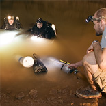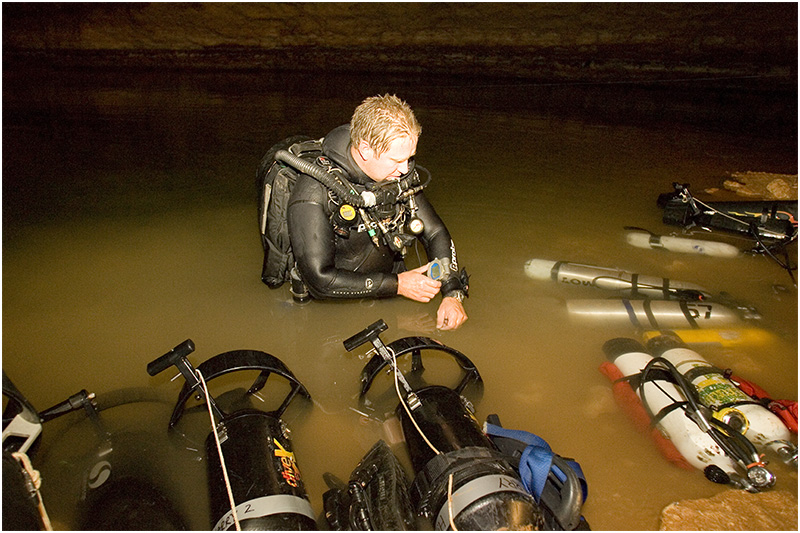 The latest man to take up the challenge of exploring the far reaches of the cave is Perth based Australian diver Dr Craig Challen. In 2008 Challen reached a new point after laying an additional 100m of line beyond his predecessor Chris Brown. Challen found himself in a very low bedding plain, against the flow of water and in little, if any, visibility. Forced to retreat due to low gas levels, he has returned to see if he can push on further past his 2008 point. With him to also challenge the far reaches is Dr Richard Harris, an Adelaide based technical diver who holds the record for the deepest dive in Australia and New Zealand. After both men have had their attempt, well-known cave diver Rick Stanton from the UK will make his inspection at the far end. Each of these explorers will make a separate attempt on different days; the nature of the cave suggests there is only room down there for one man at a time!