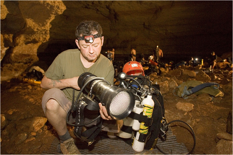This expedition was a full frontal assault on the cave using the very latest technology available to divers and underwater explorers. It was also an extension of the previous years attempts by the same team to find the physical upstream end of this submerged cave. Our small photography trip into ‘Toad Hall’ felt insignificant in comparison to the full on attacks planned for sump three and beyond ‘Toad Hall’, all of which was being set up around us. The lead divers on this expedition were Australians Dr Craig Challen, Dr Richard Harris & Rick Stanton, who alongside me, had travelled all the way from the UK. A highly experienced team of divers would support the expedition and each man in his attempt to explore the physical end of the cave system. The key to this expedition, and ultimately the success, would be the closed circuit rebreathers and long-range diver propulsion vehicles (DPV’s) utilising the very latest lithium battery technology.