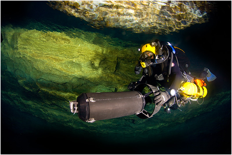 Cocklebiddy is regarded as the Mount Everest of cave dives in the southern hemisphere and only a handful of experienced and trained cave divers venture into the magnificent sump two. The cave is broken down into three dives; sump one which is 1.2km in length and runs from the lake to a rock pile air chamber. The diver than has to take all of their equipment off and carry it over a 100m of collapsed rocks before descending the rocks again to sump two. The spectacular sump two is 2.5km in length before it arrives at ‘Toad Hall’ where the diver once again removes all of their equipment and carries it over to sump three, a distance through varying chambers of 220m. Sump three is approx 1.7km in explored distance of which 1.2km is reasonably large and easy going before it closes down a lot smaller but is still large enough to swim through with back mounted diving equipment. The diver than gets to approx 1.5km into the sump where the passage then becomes too small and tight to swim with a back mounted system. From here the way on becomes a side mount equipment dive then only after approx another 100m or so the passage becomes even smaller, enough for the size of a diver to fit in and hence a ‘No Mount’ dive i.e. the divers has to push whatever it is he or she is breathing from in front of them! Of course, if you are at this point, the likelihood is that after a distance of 5.7km into the cave, you’re not using conventional scuba. The push divers on this expedition were using a variation of their own homemade rebreather configurations, which run in considerably smaller than a standard manufactured unit. These were transported to the far end of the cave before being used for the final pushes.