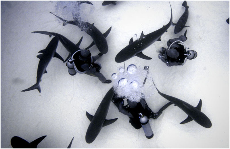 Cristina is clearly in charge as she and photographer Eddy Raphael descend to the staging area with Michael. They carry a specially designed tube containing the small fish that will be shark lunch today. This is a delicate time in the shark feeding course because if a diver is going to panic, this is when it is likely to happen.